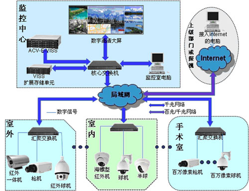 前端由数字摄像机组 成,经数字摄像机采集视频转成数字信号传送到监控主机进行录像。采集到的现场图像转为数字信号送到监控主机进行录像,在主机可切换显示每路图像,对每个现 场图像可采用单画面显示、四画面显示或轮巡显示。录像采用高清的1280×720P的分辨率进行录像,不进行压缩。回放效果和预览一样的清晰。通过内部局 域网连接,可节省大量线缆费用。